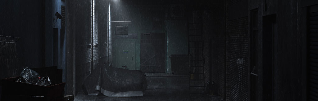It views; a black van reverse in, two figures exit, open the back doors, and disappear into the lean to; the same figures emerge carrying a black bag; load it into the van, then drive away; all of the figures disperse; the lean-to taken down; the alley empty; police tape dance from the brickwork; time stamp, zero, one, zero, one, zero, one.
